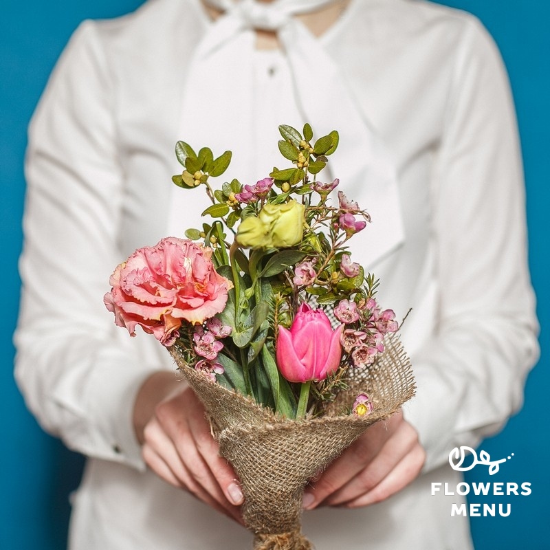 Состав: Ваксфлауэр, тюльпан, эустома, декоративная зелень Описание: Букет-комплимент из тюльпана, эустомы и веточек ваксфлауэра, обернутый в мешковину, будет приятно получить на первом свидании любой девушке или Вашей половине без повода.
