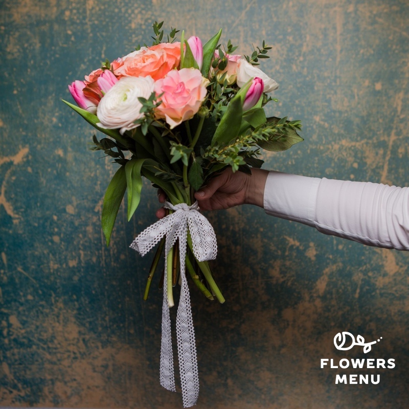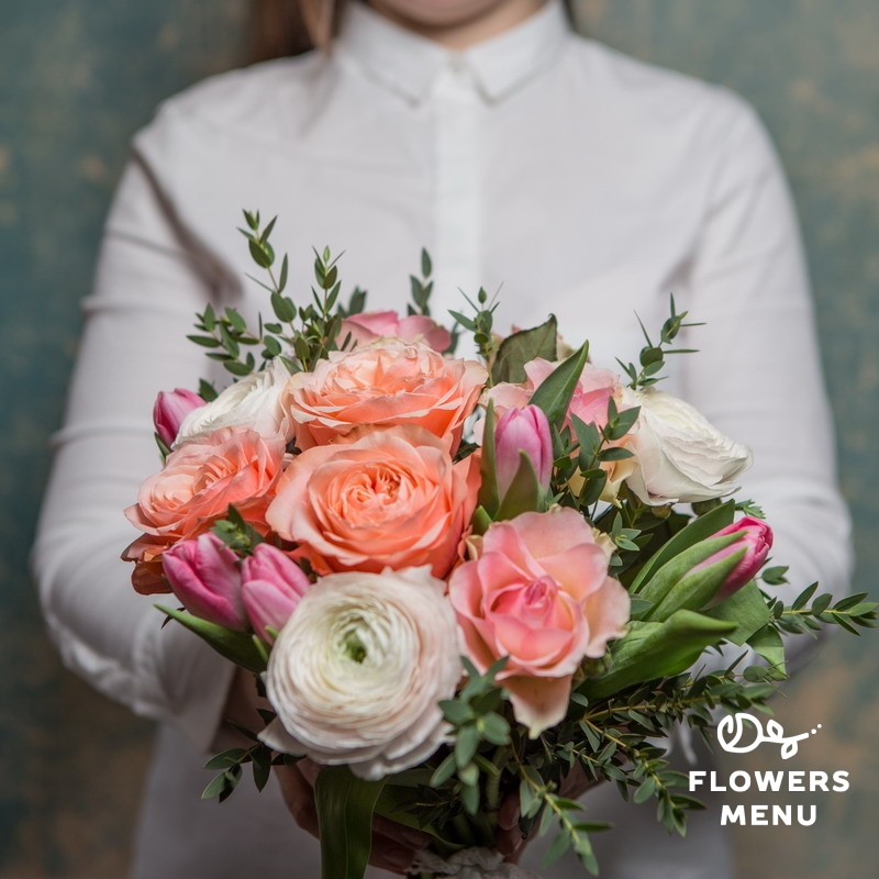 Состав: Розы Прима Балерина, розы пионовидные Вайлд Лук, ранункулюсы, тюльпаны, эвкалипт