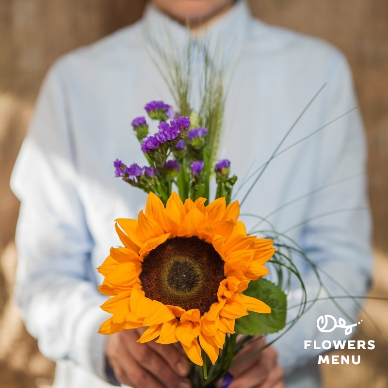 Состав: Подсолнух, статице, берграсс, тритикум Описание: По-настоящему летний и теплый букет с подсолнухом. Такой букет приятно подарить и коллеге по работе и своей половинке.