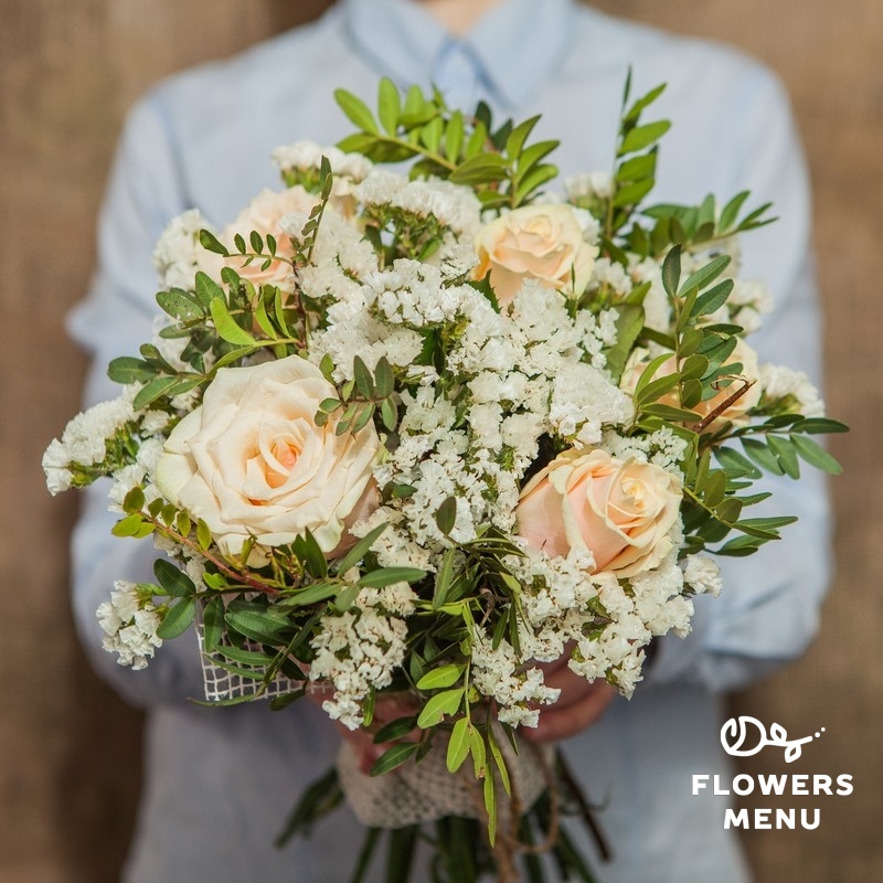 Состав: Розы Талея, статице, фисташка Описание: Благородные розы Талея цвета слоновой кости и белоснежная статице гармонично смотрятся в букете классической круглой формы, который можно вручить на любое торжество.