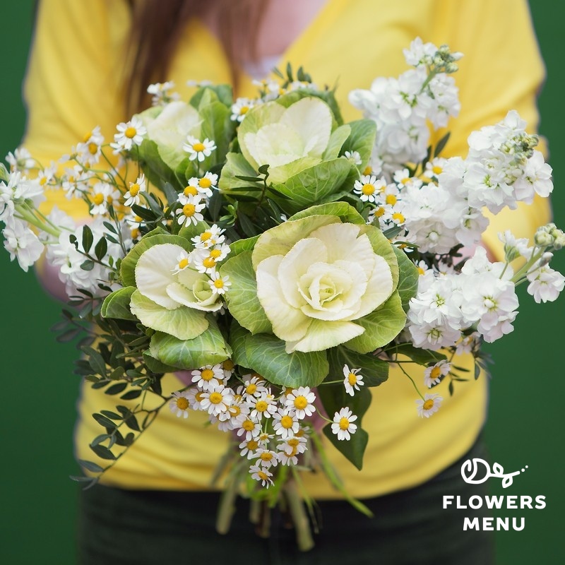 Состав: Брассика, маттиолы, танацетумы, фисташка Описание: Легкий воздушный букет свидетельствует о недосказанности чувств и раскрывает простор для фантазии.