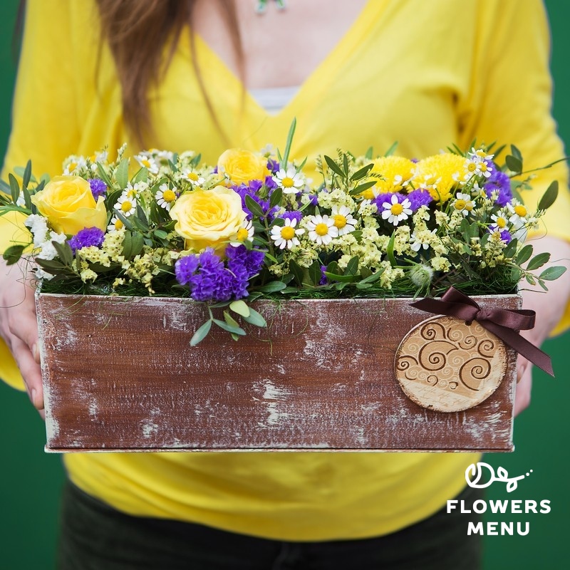 Состав: Лимониум, розы, статице, танацетум, хризантемы, декоративная коробка Описание: Нестандартный стильный подход данной композиции - подарочная коробка. Если Вы хотите выделиться своим подарком, то это Ваш вариант. Цветочная композиция будет радовать своего владельца долгое время.