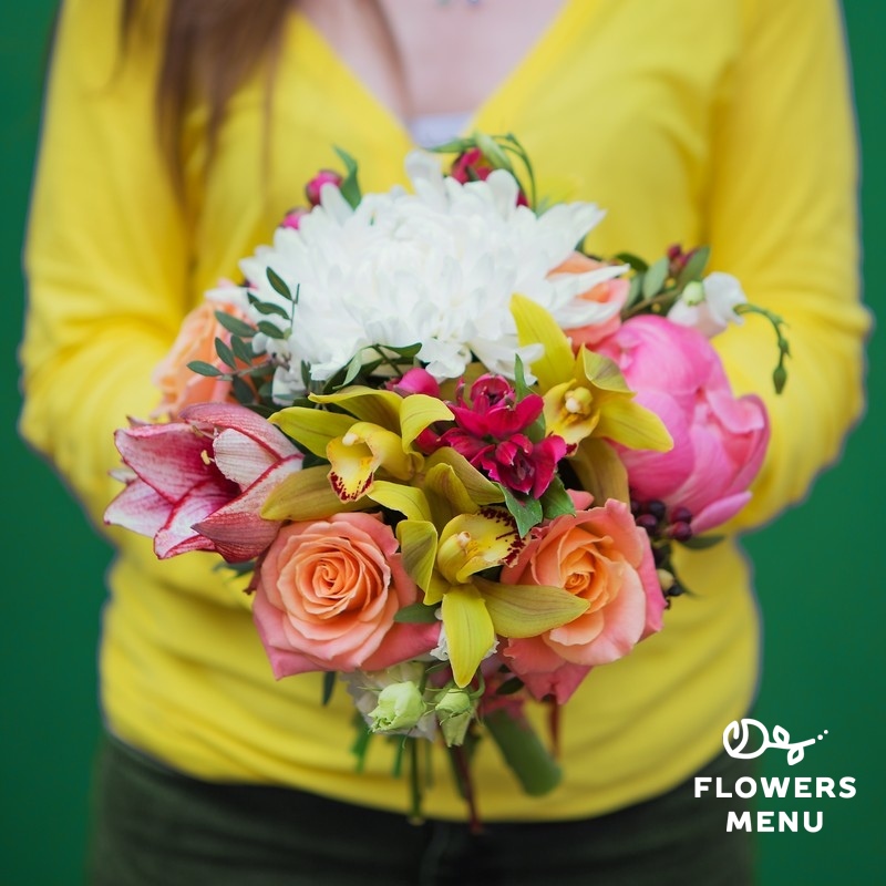 Состав: Альстромерии, амариллис, орхидеи цимбидиум, розы Мисс Пигги, пион, хризантема, эустома, фисташка Описание: Миловидный букет в пастельных тонах весьма привлекателен. Микс классических роз с экзотическими орхидеями и амариллисом.