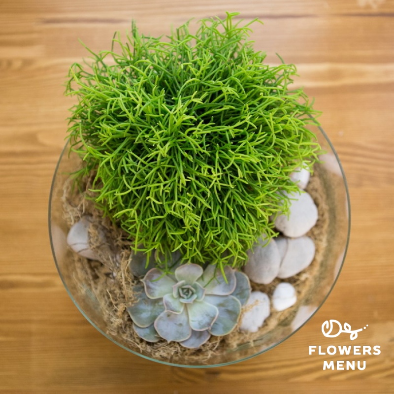 Состав: Суккуленты, грунт, декоративные камни, дренаж, мох, цветной гравий, стеклянное кашпо d=17 см, h= 12 см