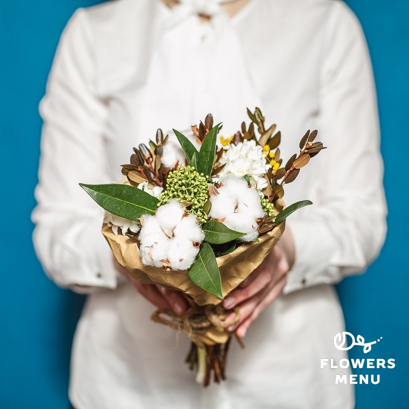 Состав: Гиацинты, мимоза, скиммия, хлопок, декоративная зелень Описание: Букет из пушистого и мягкого хлопка для девушки с тонким чувством стиля. В дополнение к хлопку используются соцветия скиммии и символы весны - гиацинты и мимоза.