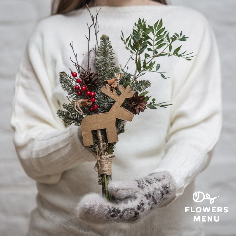Состав: Нобилис (лапник), искуственные ягоды и снег, палочки корицы, сосновые шишки, фисташка, декоративная вставка "Олень" Описание: Небольшой сказочный букет создаст новогоднее настроение. Забавный олень в центре - великолепный штрих этого букета.
