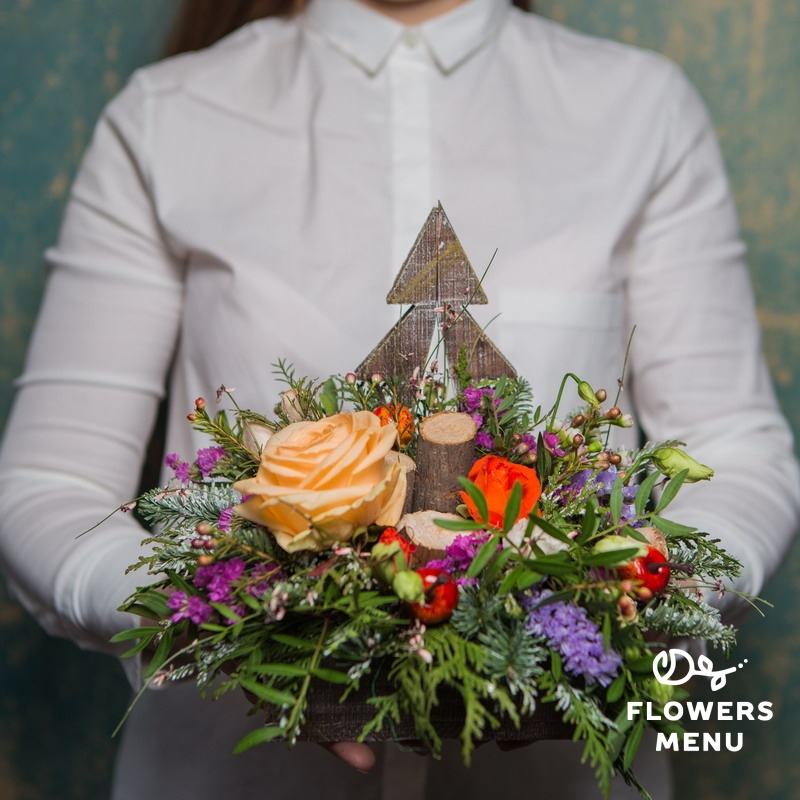 Состав: Ваксфлауэр, розы кустовые Бэйб, нобилис (лапник), Роза Мисс Пигги, статице, фисташка, декоративные вставки, оазис, деревянное кашпо