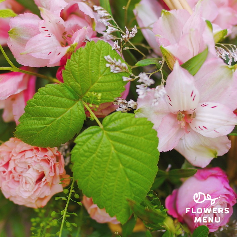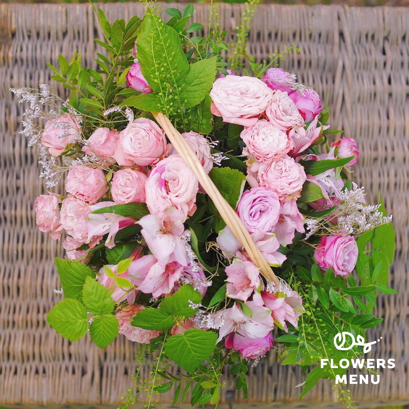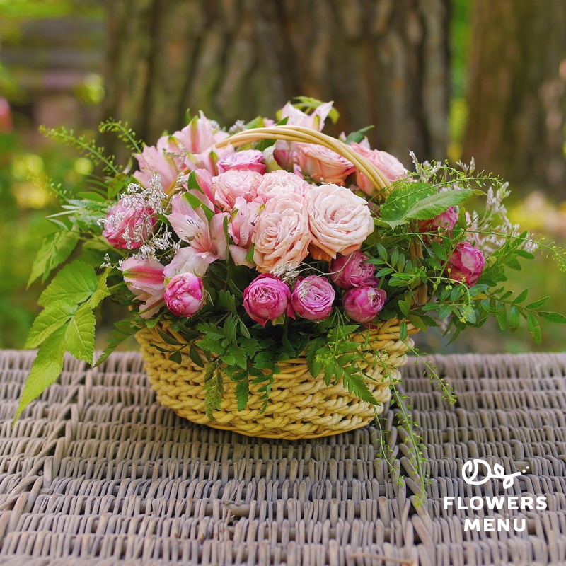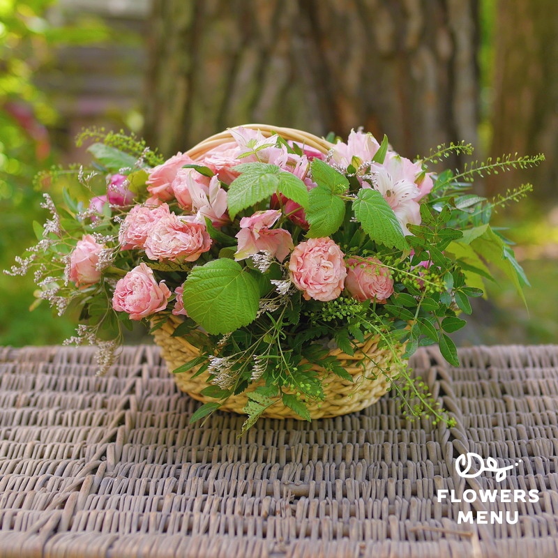Состав: листья малины, лимониум, роза пионовидная, альстромерия, тласпи, папоротник, фисташка, корзина. Описание: Ажурная летняя корзина с пионовидными розами и листьями малины подойдет для любого поздравления.