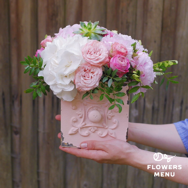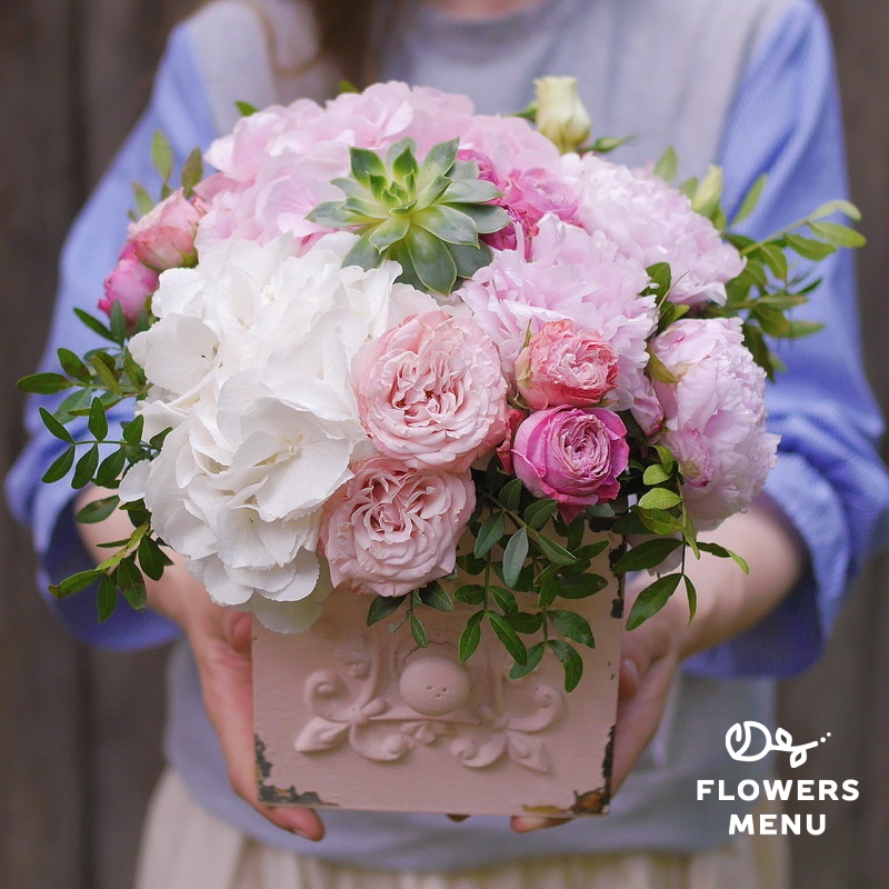 Состав: Гортензии, пионы, роза кустовая пионовидная Бомбастик, розы кустовые пионовидные Леди Бомбастик, эустомы, эхеверия, фисташка, оазис, деревянное кашпо