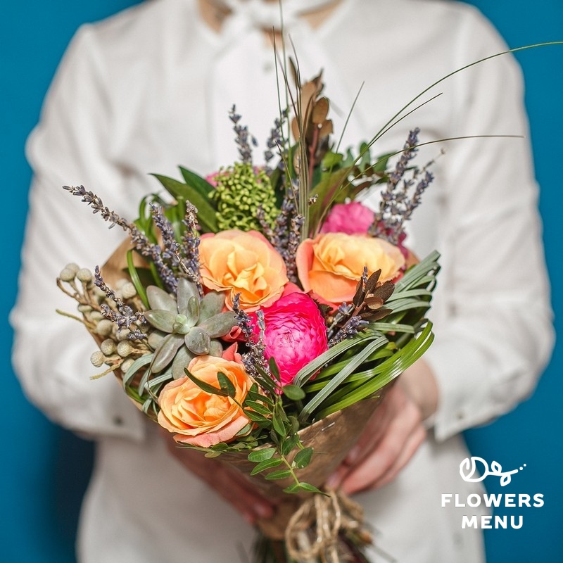 Состав: Лаванда, ранункулюсы (мини), роза Мисс Пигги, скиммия, эхеверия, багульник, берграсс, бруния Описание: Букет в стиле прованс с нежными розами и яркими ранункулюсами с добавлением ароматных веточек лаванды и багульника. Эхеверия и шишечки брунии дополняют этот милый букет.
