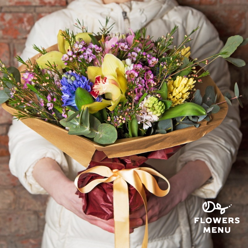 Состав: Альстромерия, ваксфлауэр, гиацинты, орхидеи цимбидиум, эвкалипт