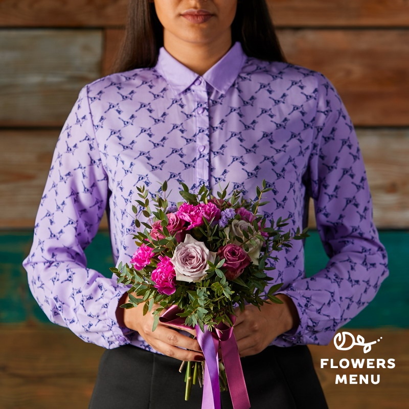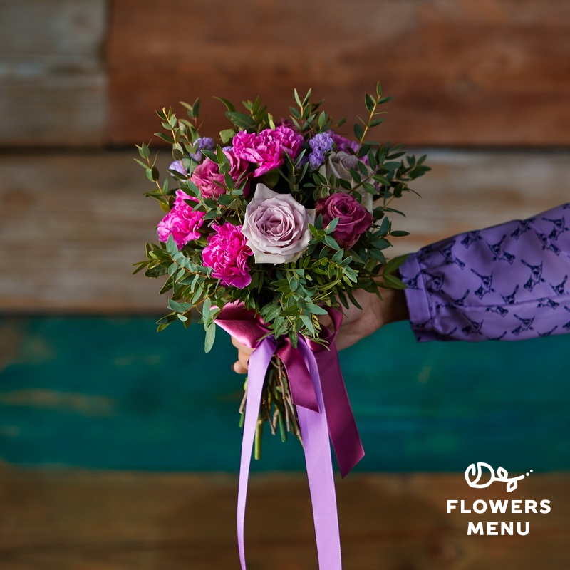 Состав: Гвоздики, розы Дип Перпл, розы Морнинг Дью, статице, фисташка, эвкалипт