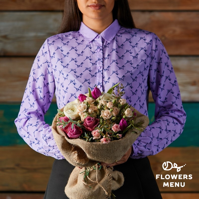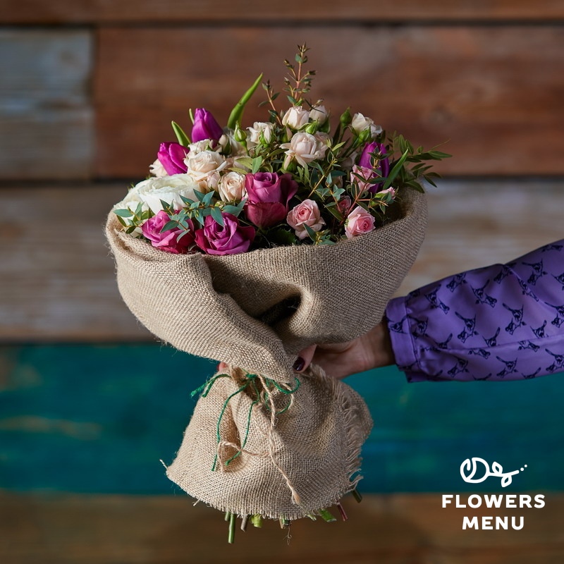 Состав: Ранункулюсы, розы Дип Перпл, розы кустовые Супер Баблс, тюльпаны, фисташка, эвкалипт