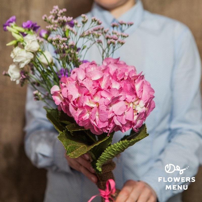 Состав: Гортензия, гвоздика кустовая, лимониум, эустома Описание: Пышная гортензия с изящной эустомой и пушистым лимониумом подходит в качестве подарка для грациозной девушки, которая оценит Ваш цветочный выбор.