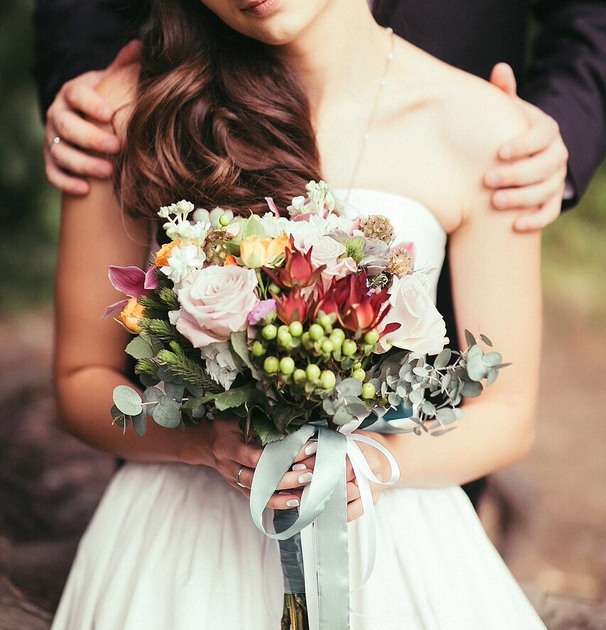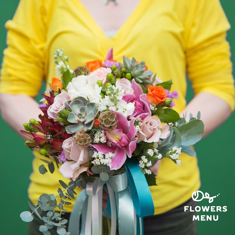 остав: Гиперикум, леукадендроны, маттиолы, орхидеи цимбидиум, розы Мента, розы кустовые Бейб, скабиоза, эхеверия, эвкалипт Описание: Очень интересный по форме и богатый по содержанию букет будет актуален и как букет невесты и как подарочный.