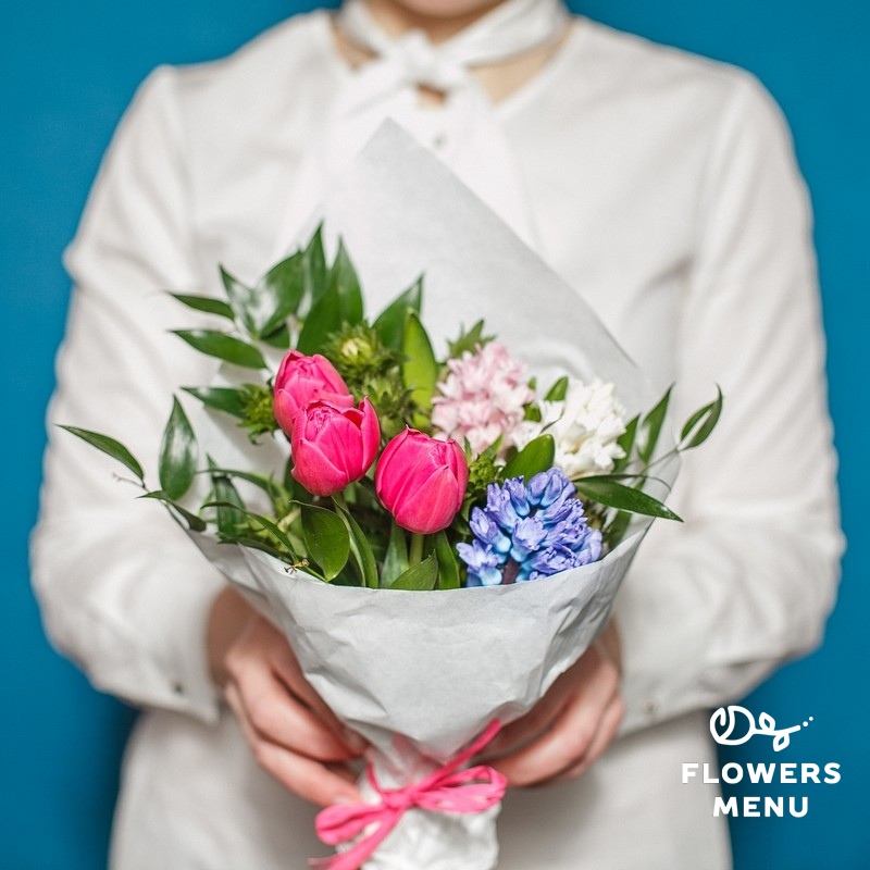 Состав: Гиацинты, стакешия, тюльпаны, рускус Описание: Благоухающие гиацинты, прелестные тюльпаны в окружении декоративной зелени будет приятно получить снежной морозной зимой и ранней весной.