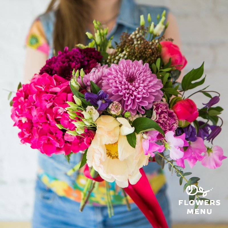 Состав: Гортензия, гвоздика, клематисы, латирусы, пиерис, пионы, хризантемы, эустомы, фисташка, эвкалипт