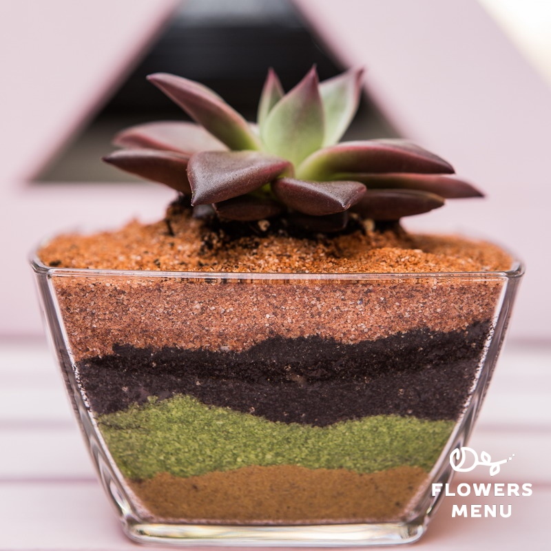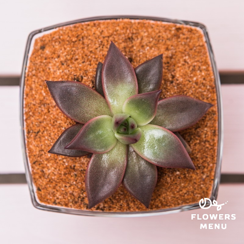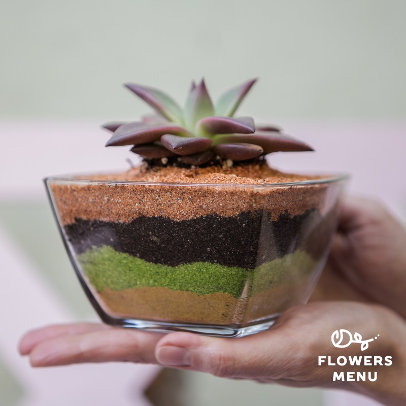 Состав: Суккулент Эхеверия, грунт, цветной песок, стеклянное кашпо d=13 см, h=10 см