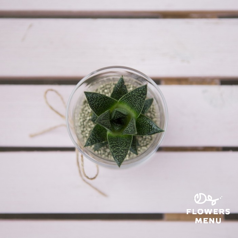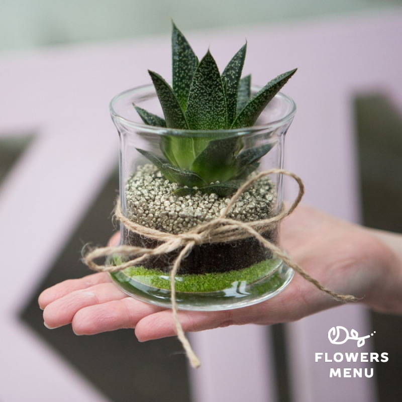 Состав: Сукулент, гравий, грунт, цветной песок, стеклянное кашпо d= 7-8 см, h=10 см