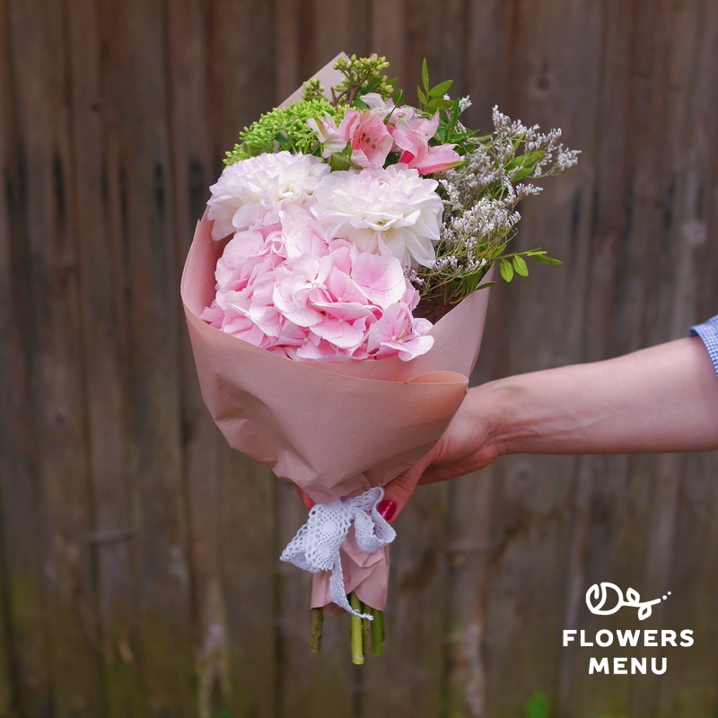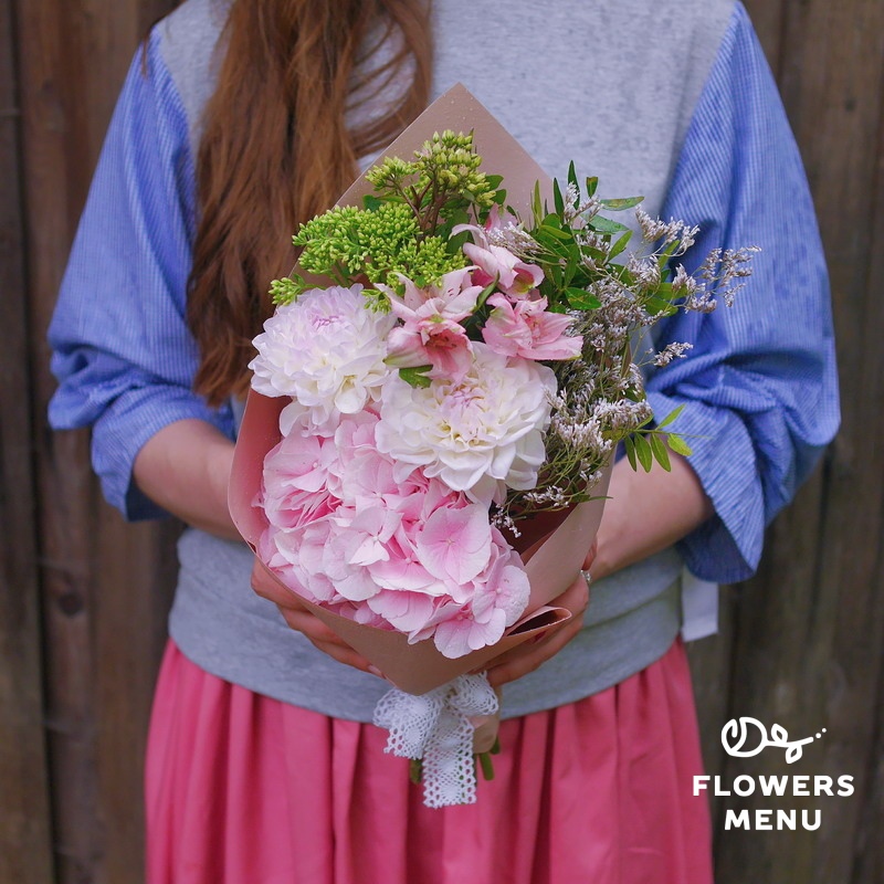 Состав: Альстромерии, георгины, гортензия, лимониум, седум