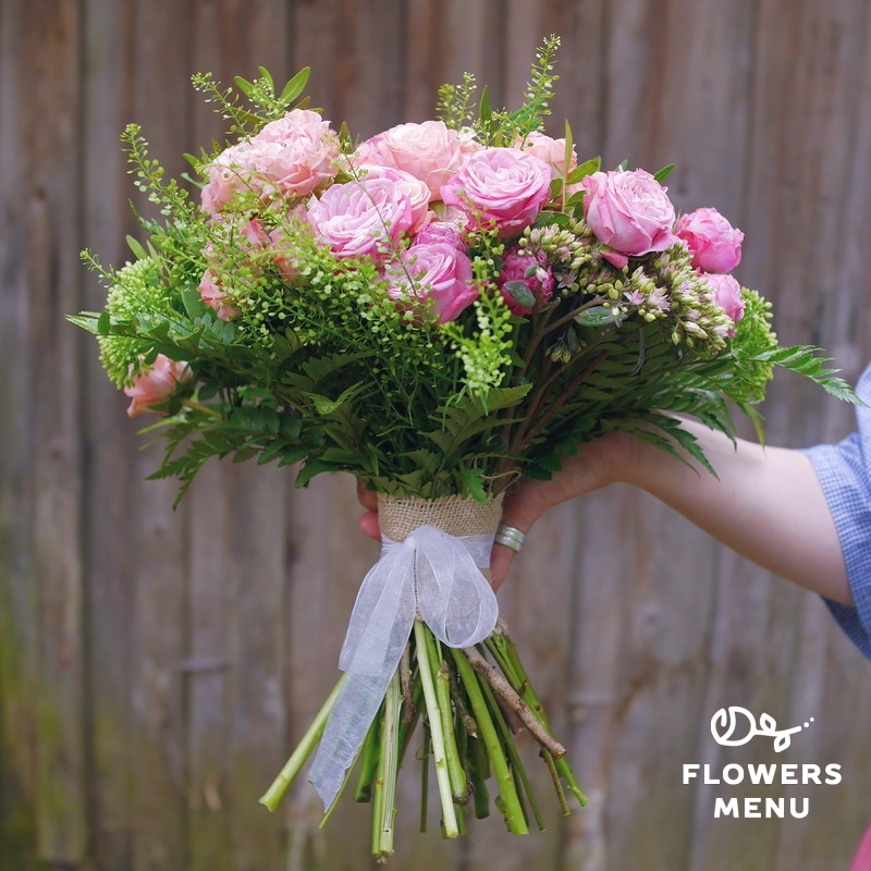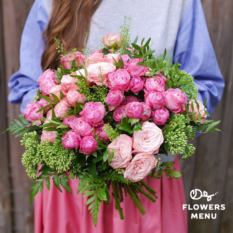Состав: Розы кустовые пионовидные Бомбастик, розы кустовые пионовидные Леди Бомбастик, озатамус или седум, папоротник, тласпи, фисташка