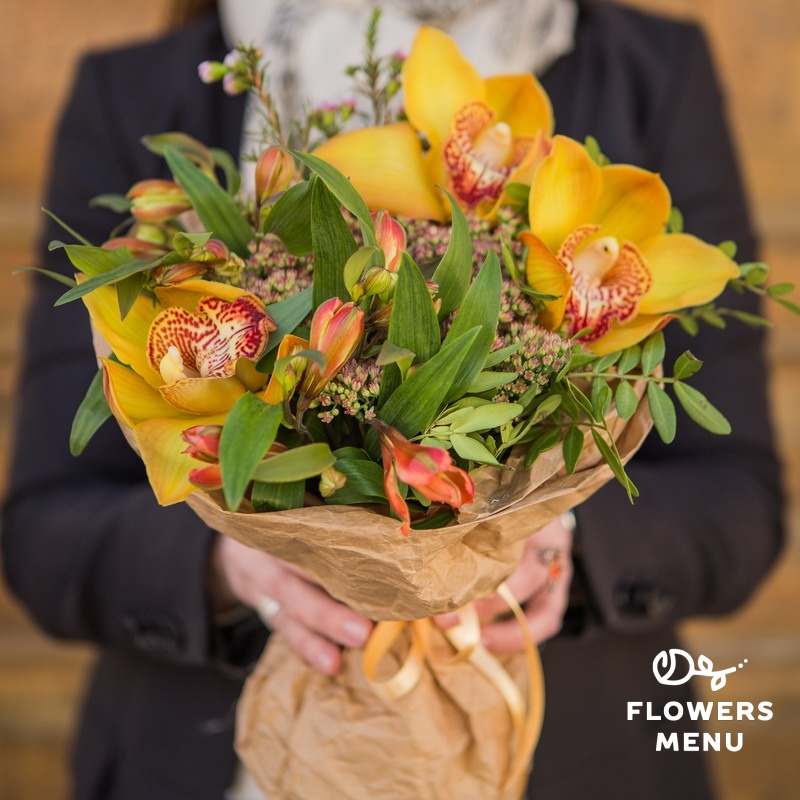 Состав: Альстромерии, орхидеи цимбидиум, ваксфлауэр, седум или озатамнус, фисташка Описание: Дивно сочетаются орхидеи цимбидиум с альстромерией огненных оттенков. Этот букет будет приятно получить на свидании, в день рождения и в любой другой праздничной обстановке.