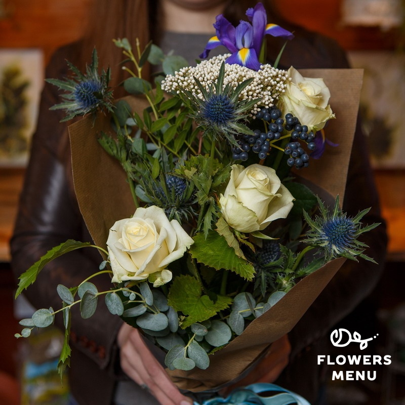 Состав: Вибурнум, ирисы, озатамнус, розы Аваланж, эрингиум, фисташка, эвкалипт