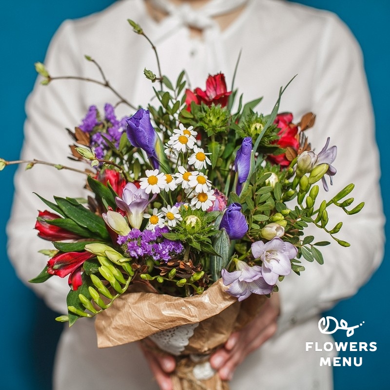 Состав: Альстромерии, ирисы, статице, танацетумы, фрезии, фисташка Описание: Продуманная "небрежность" этого букета передает ощущение, будто его собрал сам дарящий. Как будто прошел по лугу и нарвал всю эту красоту: ромашки, ирисы, альстромерии, фрезию воедино.