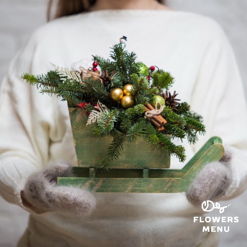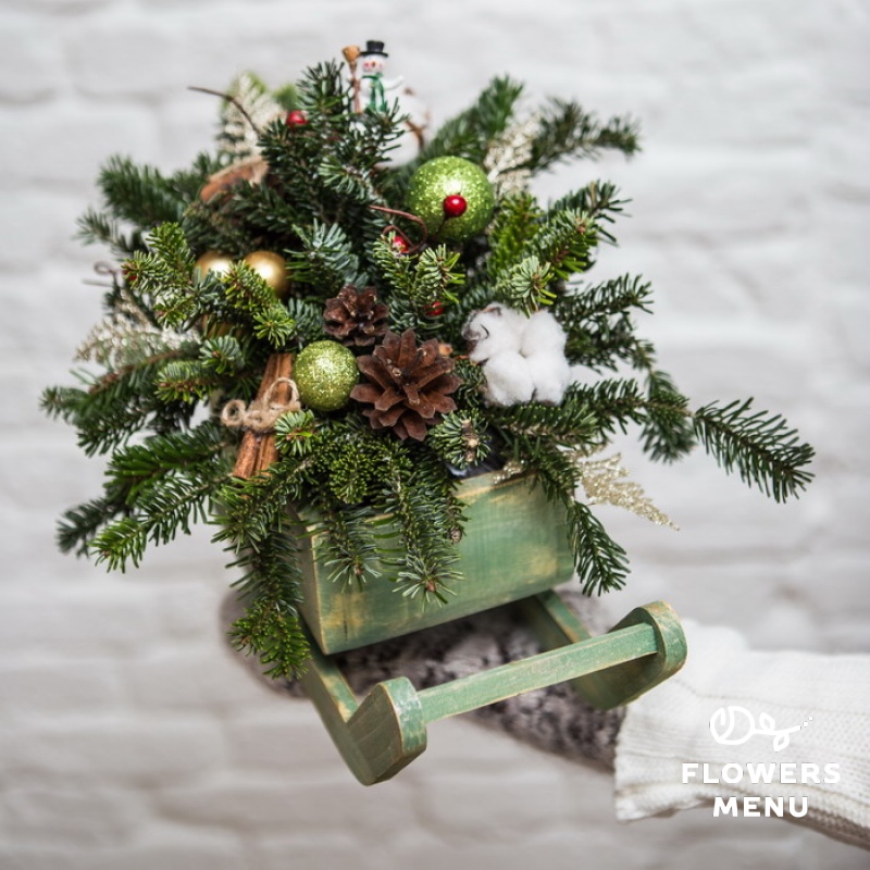 Состав: Нобилис (лапник), палочки корицы, сосновые шишки, хлопок, декоративные вставки, оазис, деревянное кашпо