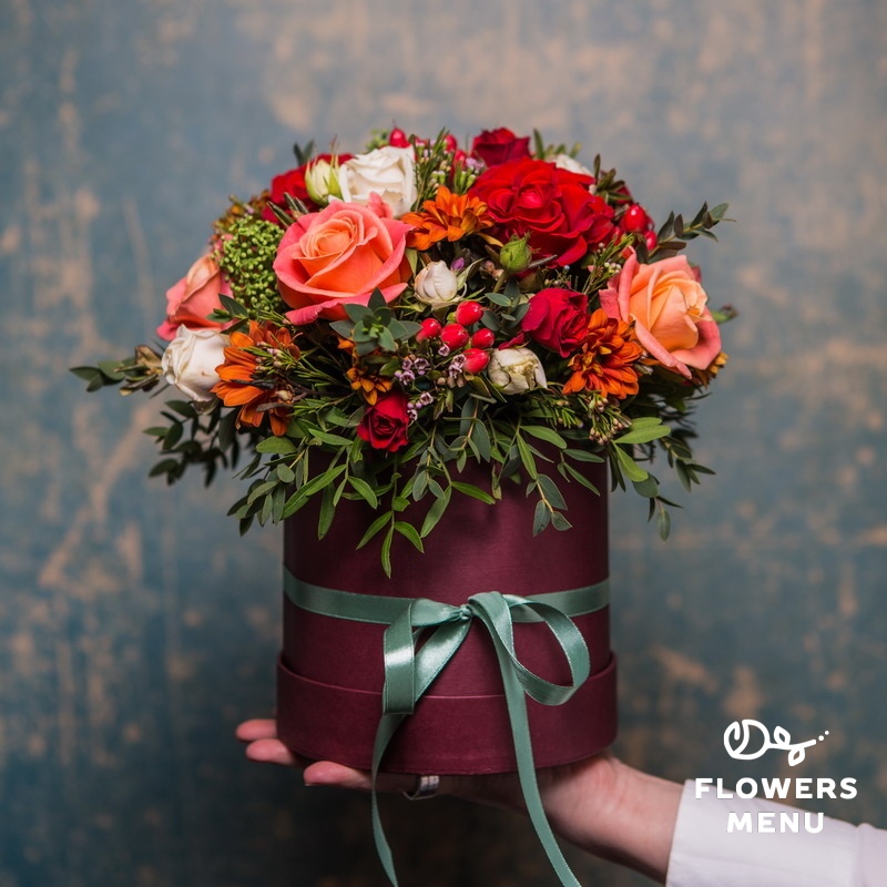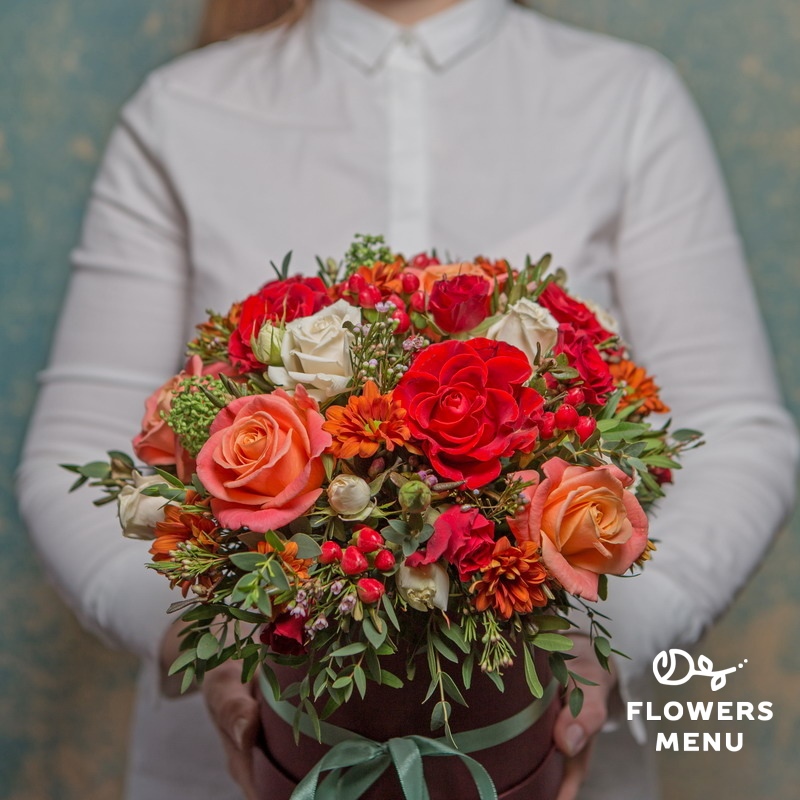 Состав: Ваксфлауэр, гиперикум, розы кустовые Мирабель, розы кустовые Cупер Баблс, розы Мисс Пигги, розы Эль Торо, скиммия, статице, хризантема Сантини, эвкалипт, декоративная зелень, оазис, декоративная коробка