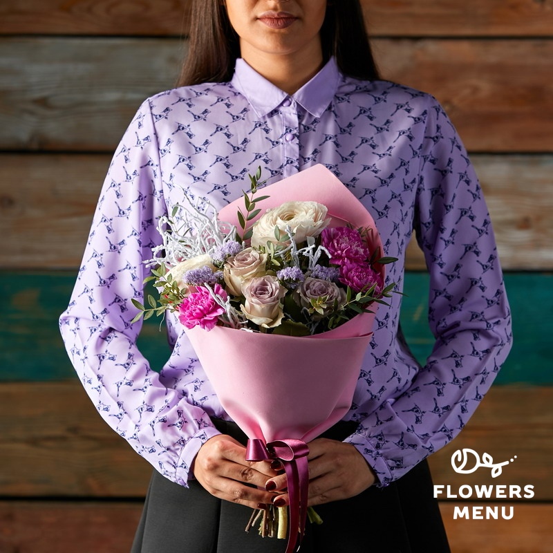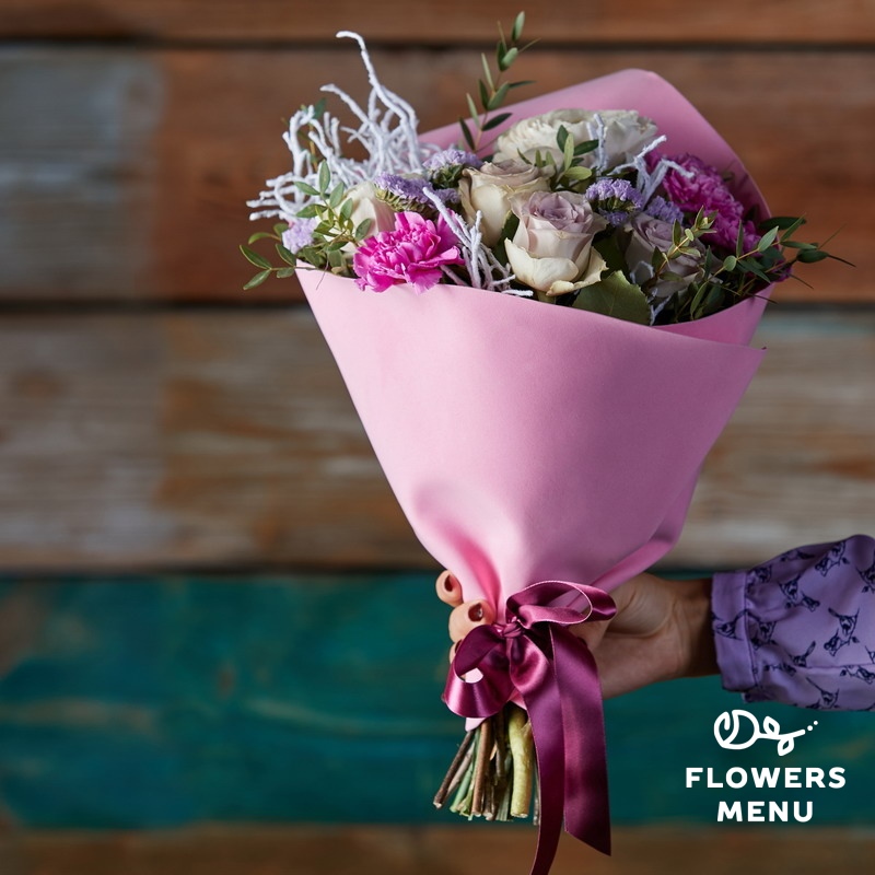 Состав: Гвоздики, ранункулюсы, розы Морнинг Дью, статице, фисташка, черничник крашенный, эвкалипт