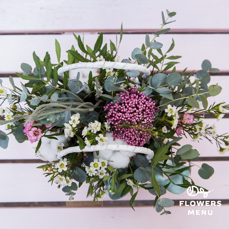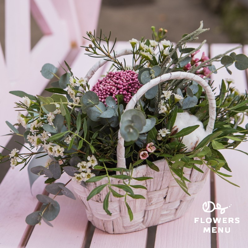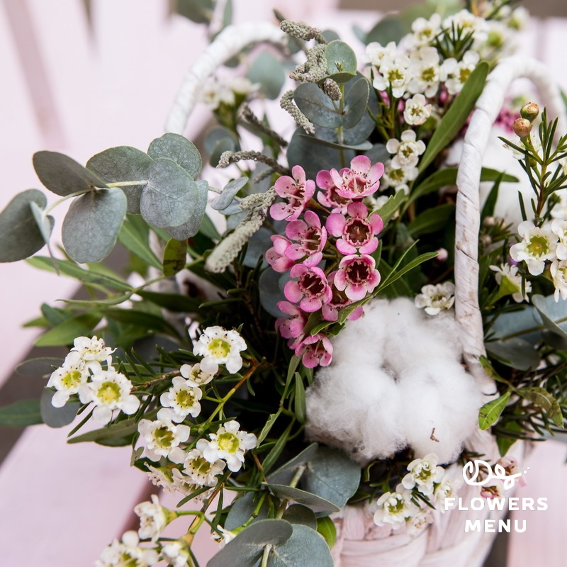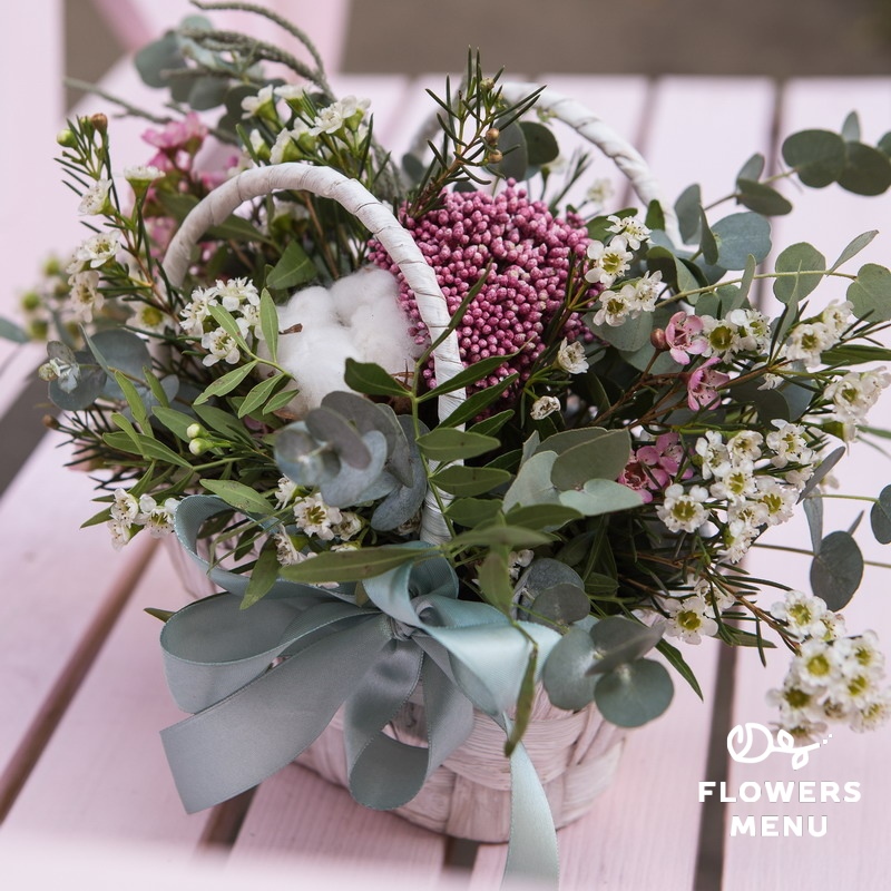 Состав: Ваксфлауэр, бруния, озотамнус, хлопок, фисташка, эвкалипт, оазис, корзина-сумочка Описание: Ажурная корзиночка с ваксфлауэром, с пушистым хлопком, эвкалиптом и озотамнусом перенесет ее обладательницу из водоворота будничной жизни в сказочный лес.
