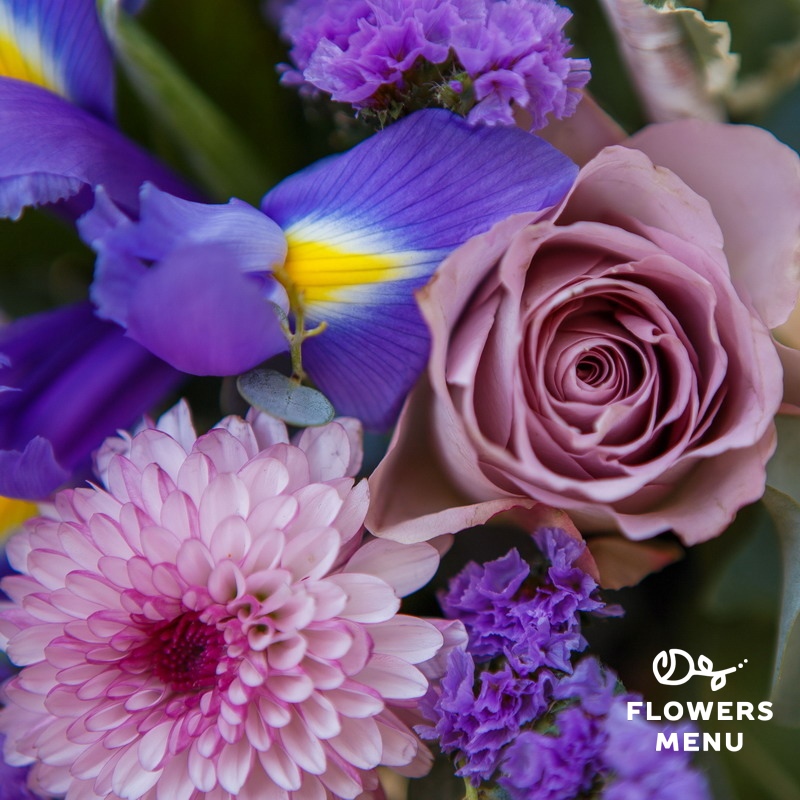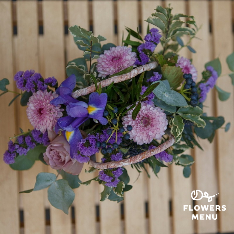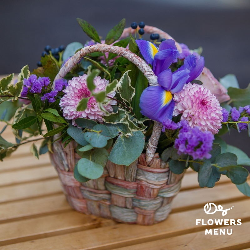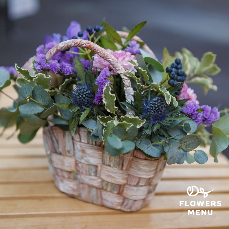 Состав: Вибурнум, ирис, роза Пятая Авеню, статице, хризантемы Бигуди Перпл, эрингиум, питтоспорум, фисташка, эвкалипт, оазис, корзина-сумочка