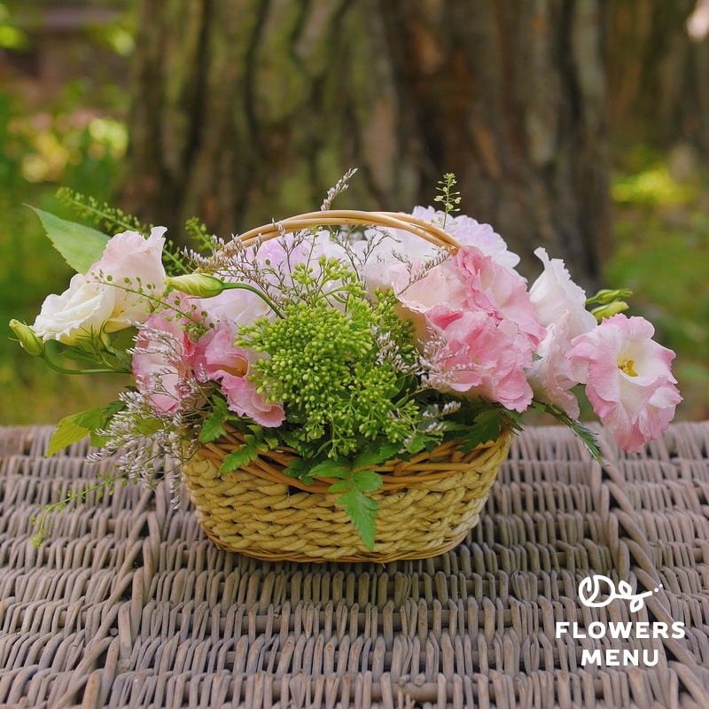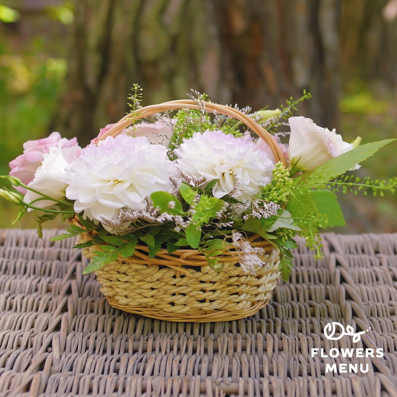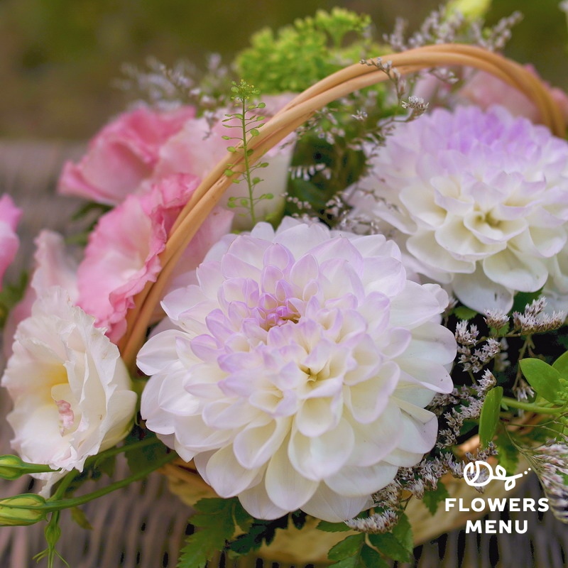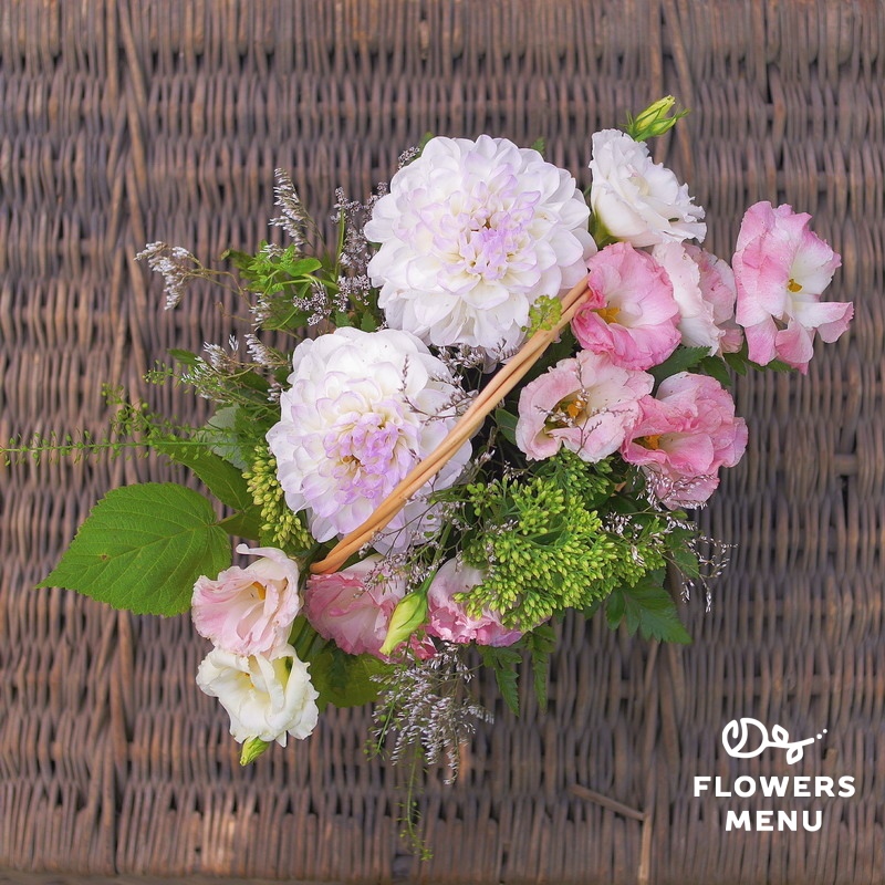 Состав: Георгины, лимониум, эустомы, веточки малины, озатамус или седум, папоротник, тласпи, корзина. Описание: Легкая и воздушная корзина , напоминающая воздушный зефир) Дарите девушкам цветы)