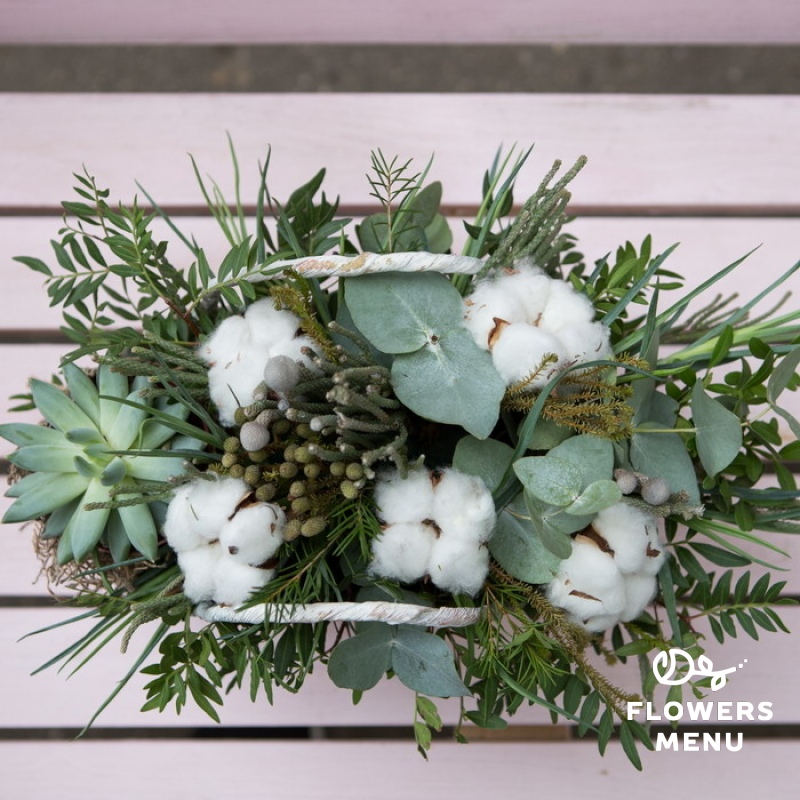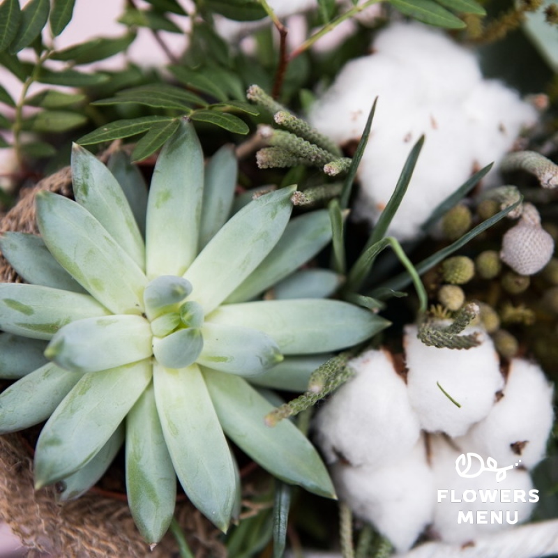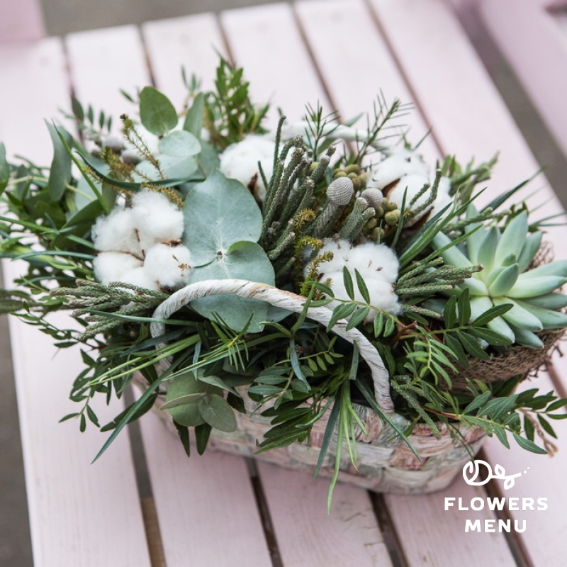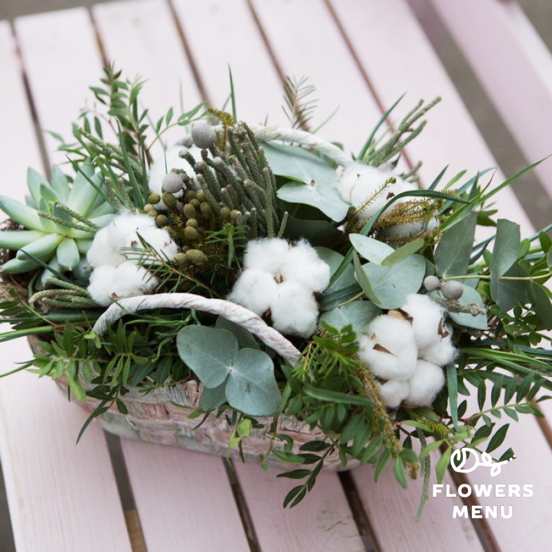 Состав: эхеверия, бруния, эвкалипт, фисташка, хлопок, корзина. Описание: Монохромное сочетание цветов в корзине, подойдет для подарка девушке с отменным вкусом)