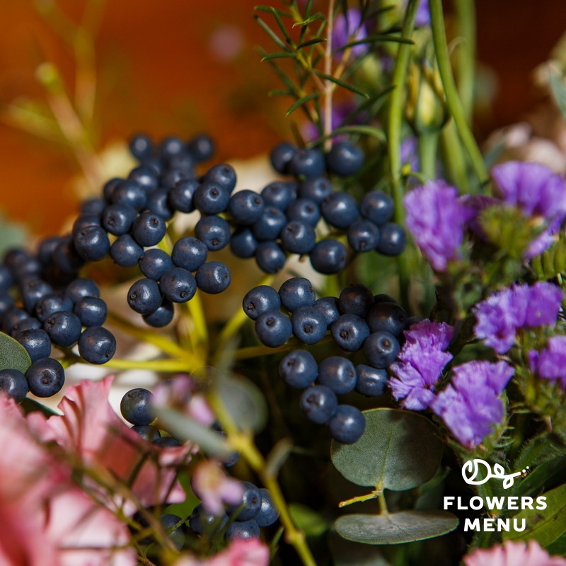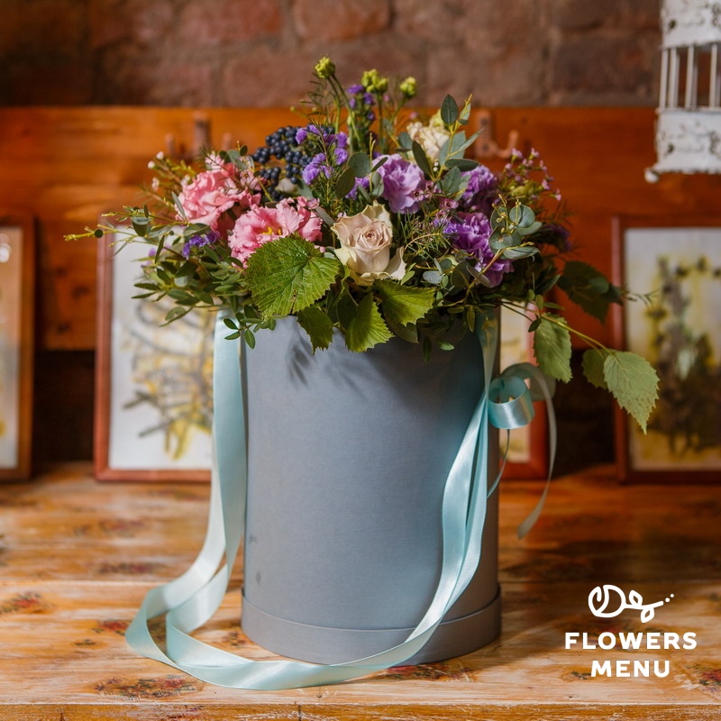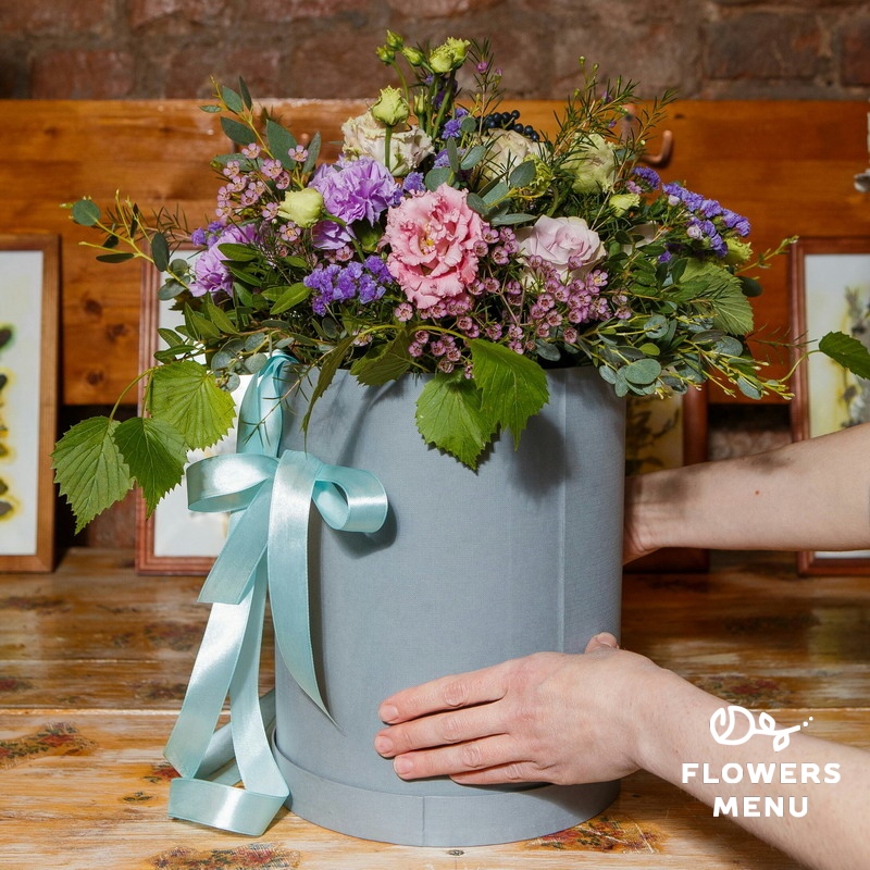 Состав: Ваксфлауэр, вибурнум, гвоздики, розы Пятая Авеню, статице, эустомы, фисташка, эвкалипт, оазис, декоративная коробка