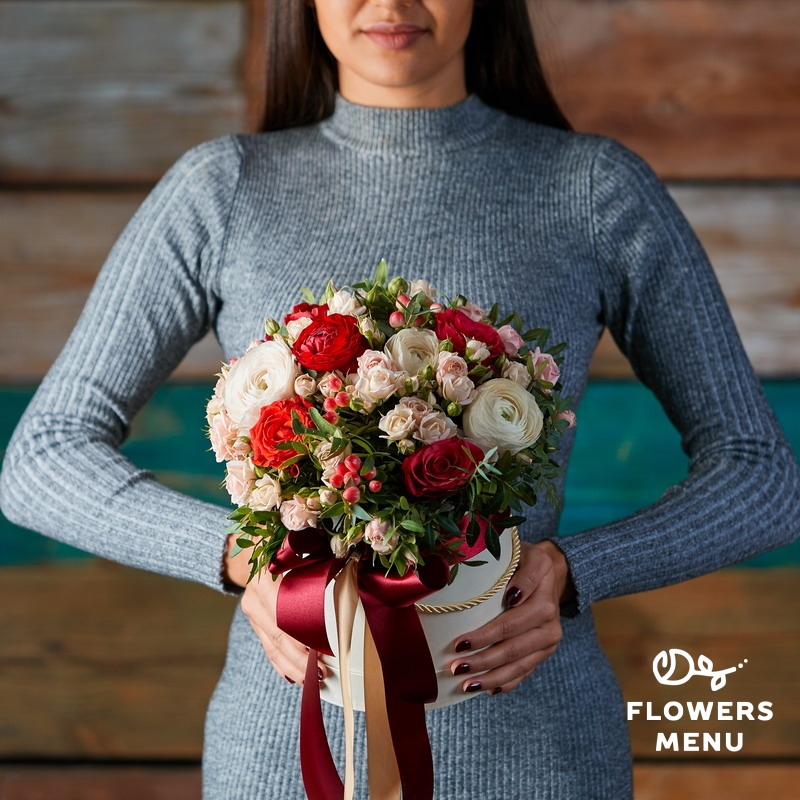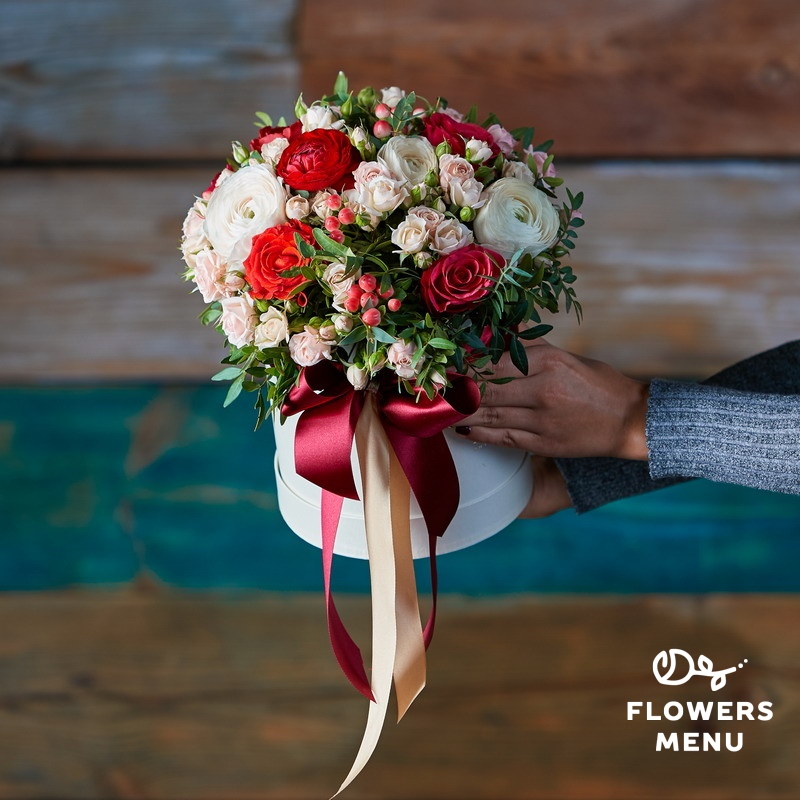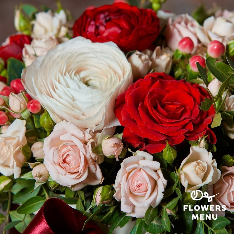 Состав: Гиперикум, ранункулюсы, розы кустовые Супер Баблс, фисташка, оазис, декоративная коробка