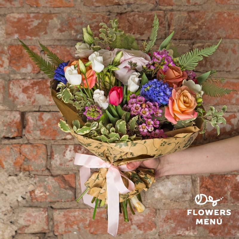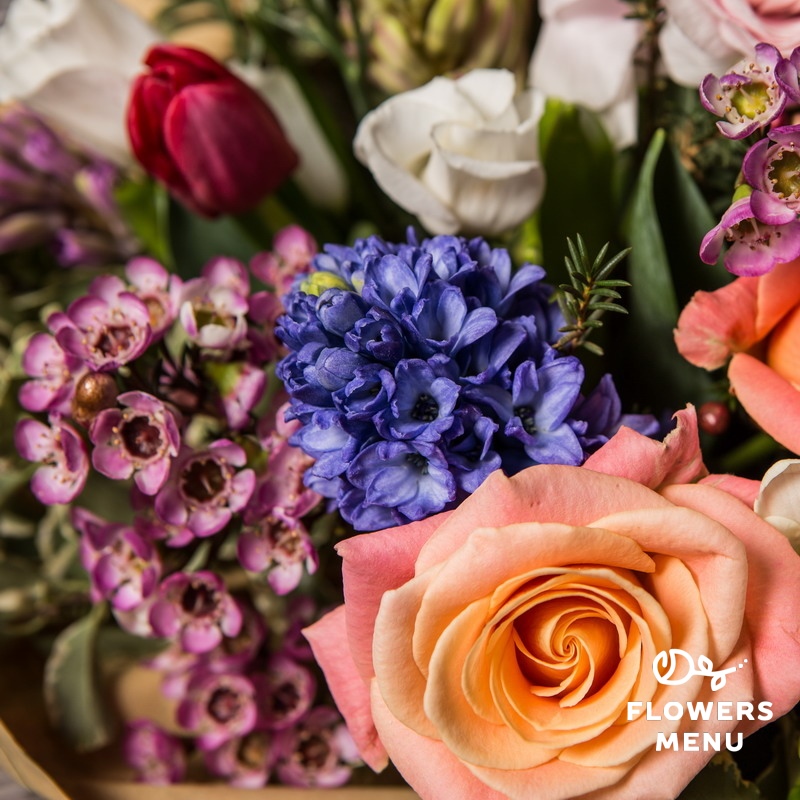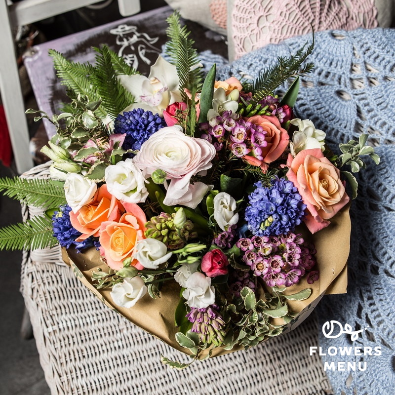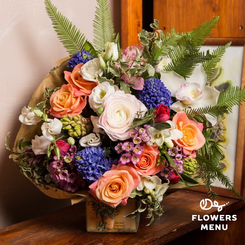 Состав: Альстромерия, ваксфлауэр, гиацинты, орхидея цимбидиум, ранункулюс, розы Мисс Пигги, тюльпаны, эустомы, амбрелла, питтоспорум