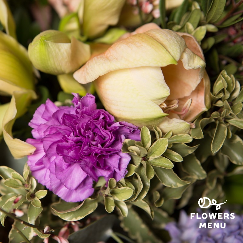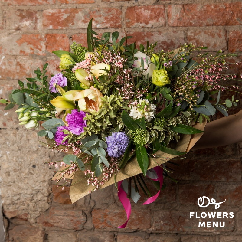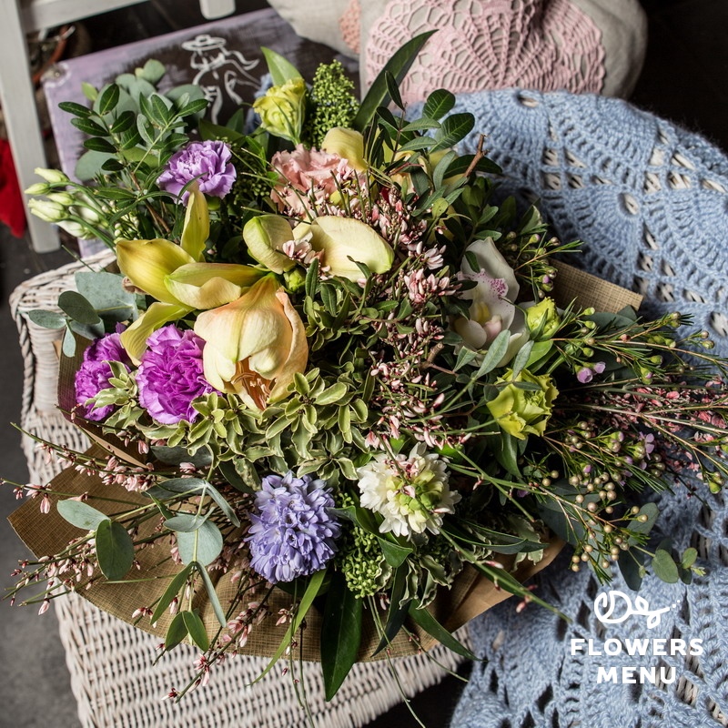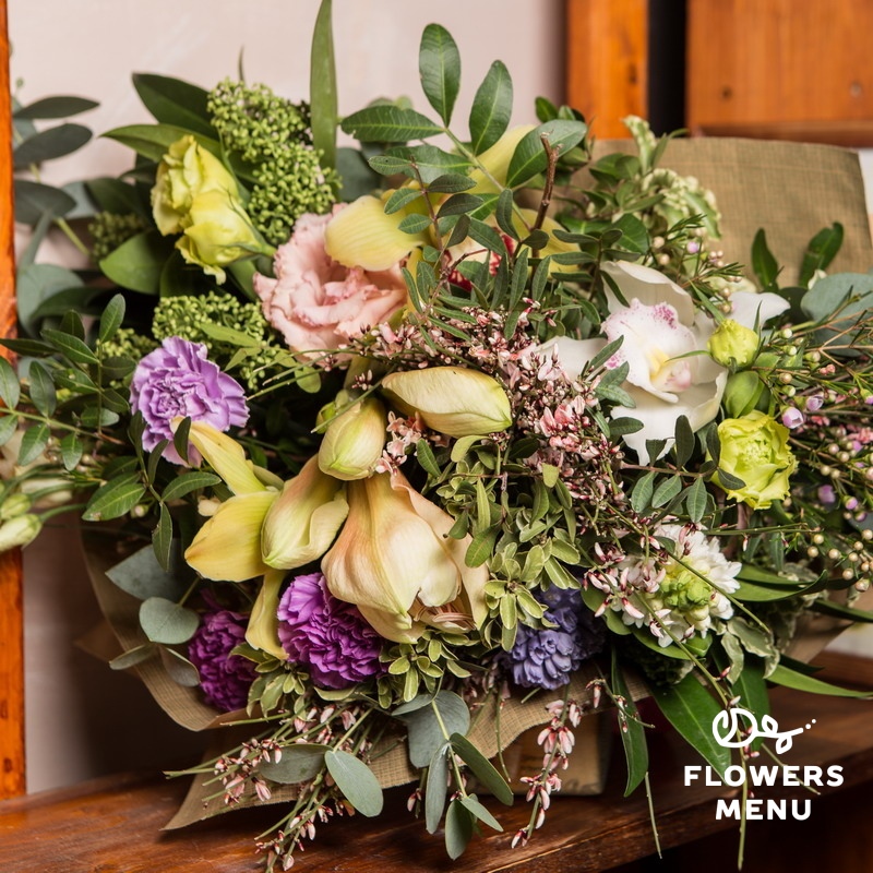 Состав: Амариллис, ваксфлауэр, гвоздики, гиацинты, гениста, орхидеи цимбидиум, эустомы, питтсопорум, скиммия, фисташка, эвкалипт